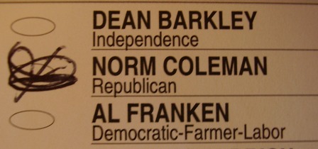 Here is a ballot that Team Franken challenged as not showing clear intent to vote for Coleman (thanks to Freedom Dogs ):